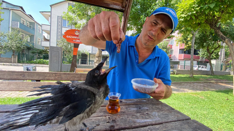 3.5 ay önce yavru kargayı yaralı olarak yolda bulduğunu söyleyen Ömer Tek, "Sürekli et yiyor, etten başka bir şey yemez. Karga için yabani derler ama insana çok bağlı. Bir şey bulduğu zaman getiriyor, saklıyor. Nereye gitsem peşimden geliyor, omzuma, başıma konuyor. İnsana sadık bir hayvan. Organik Rize çayı içiyor, ‘Kahve içmem, Rize çayı içerim' diyor. Ben Rizeli olduğum için onu da Rize çayına alıştırdım. Beni hiç bırakmıyor, annesi, babası zannediyor. İlk görenler şaşırıyor ve korkuyorlar ama sonrasında sevmeye başlıyorlar. Herkes satın almak istiyor ama parayla satılmaz. Değeri parayla ölçülemez" diye konuştu.