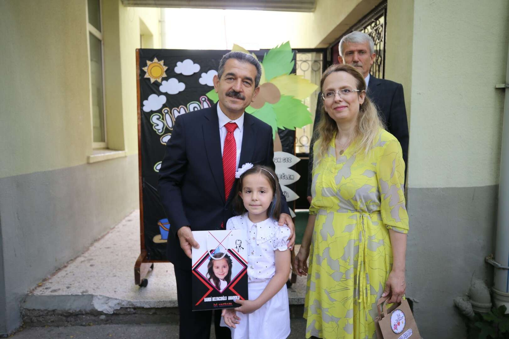 Derslikleri gezen Vali Birol Ekici ile İl Milli Eğitim Müdür Veli Ali Ergin, öğrencilere karnelerini verdi.