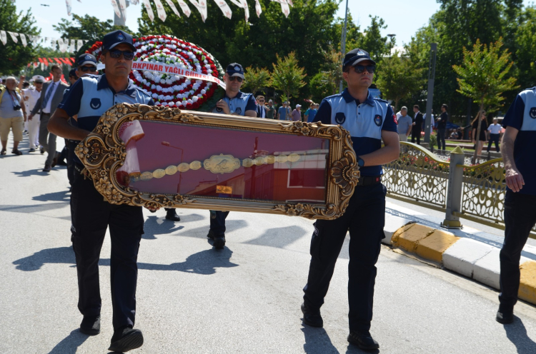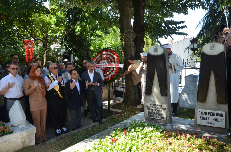 Konuşmaların ardından 663’üncü Kırkpınar Yağlı Güreşleri Korteji Selimiye Meydanı önünden ilk önce Edirne Belediyesi önüne daha sonra ise Atatürk Anıtı’na yürüdü. Atatürk Anıtı’na 663’üncü Tarihi Kırkpınar Yağlı Güreşleri çelengi Edirne Valisi Yunus Sezer, Edirne Belediye Başkanı Av. Filiz Gencan Akın ve Türkiye Geleneksel Güreşler Federasyonu Başkanı İbrahim Türkiş tarafından sunuldu. Daha sonra Edirne Belediye Bandosu eşliğinde saygı duruşu ve İstiklal Marşı okundu. Daha sonra söz ve müziği Beyazıt Sansıya ait olan Kırkpınar Marşı söylendi. Marşa, Beyazıt Sansının oğlu Seven Sansı da eşlik etti. Atatürk Anıtı’na çelenk sunumunun ardından 663’üncü Kırkpınar Yağlı Güreşleri Korteji Pehlivanlar Mezarlığı’na hareket etti. Mezarlıkta vefat eden pehlivanlara dualar okunarak mezarlarına çiçek konuldu.