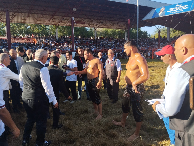 Edirne’de bu yıl 663’üncüsü düzenlenen Kırkpınar Yağlı Güreşleri’nde başpehlivanlık final müsabakası başlamadan önce başpehlivanlar Yusuf Can Zeybek ve Mustafa Taş’a, protokol tarafından başarı dilekleri sunuldu.