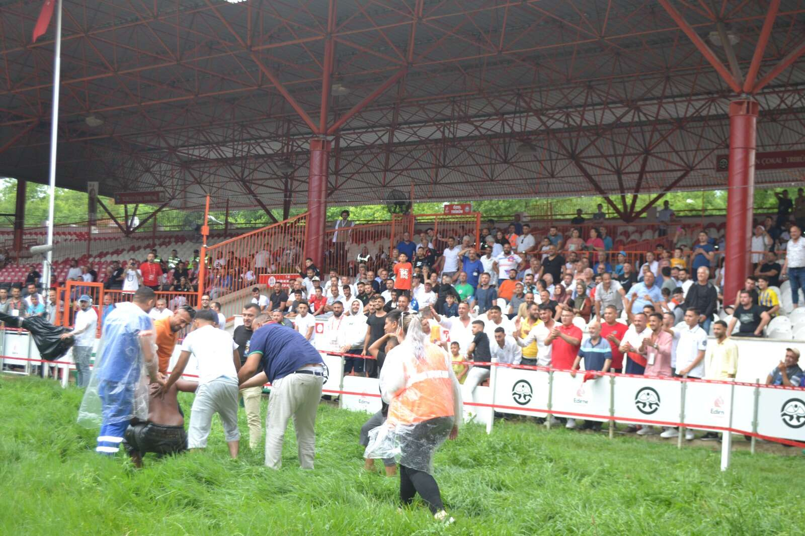 Kazanan sporculara destek olmak isteyen vatandaşlar sahanın içerisine girerek güreşçisine sarılarak tebrik etti. Güvenlik güçleri anında müdahile ederek vatandaşları türbine gönderdi.
