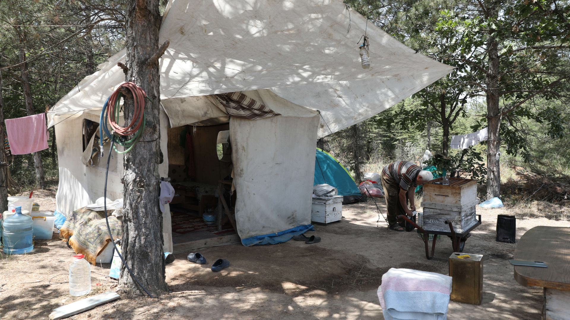 Sıcaklıkların 35 derecenin üzerinde seyrettiği Kırklareli'nde, İzmirli arıcı bal veriminin düşmemesi için de yoğun mesai harcıyor. Bölükoğlu, babasından öğrendiği sıcakla mücadele yöntemini kendi kovanlarında uyguluyor.