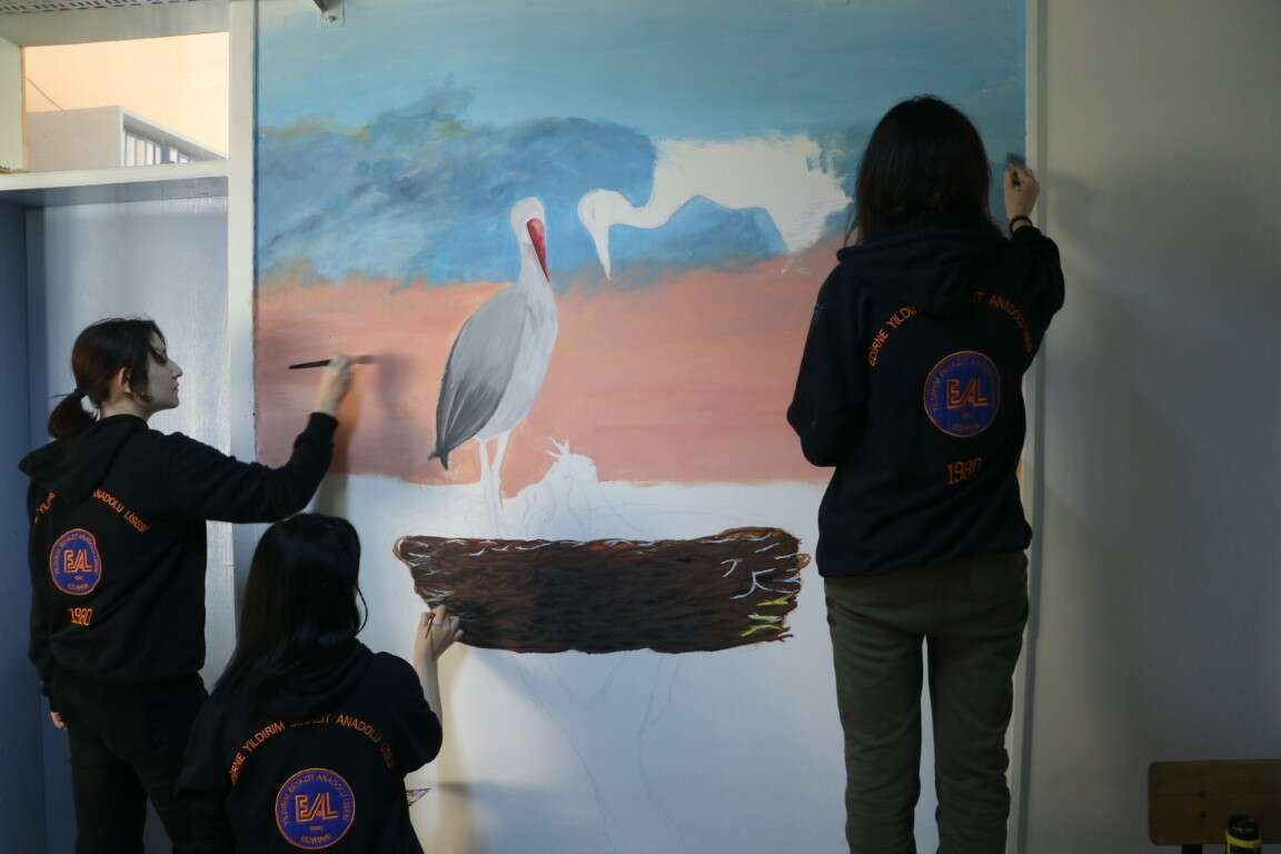 Okul yönetimi bu yıl, bahar ayları geldiğinde yolları gözlenen ve maskot haline gelen leylekleri lisenin "sanat sokağı" koridoruna resmetme kararı aldı.