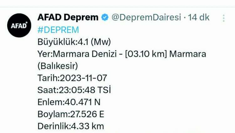 AFAD'tan alınan verilere göre bugün Marmara Denizi(Balıkesir) Saat 23:05'de 4.1 büyüklüğünde deprem meydana geldi. Depremin merkez üssünün enlem 40.471 N, boylam 27.526 E koordinatlarında ve yerin 4.33 km derinliğinde olduğu belirtildi.