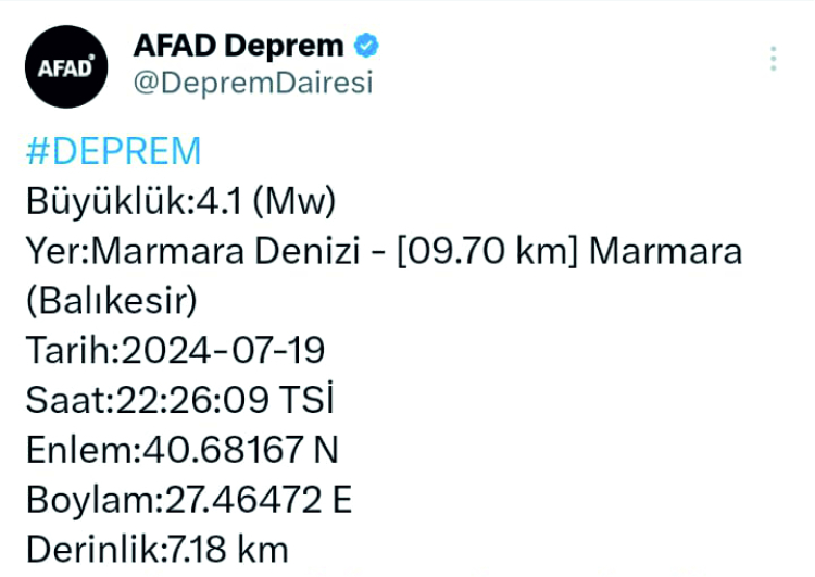 Afet ve Acil Durum Yönetimi Başkanlığı (AFAD) verilerine göre, saat 22.26'da Marmara Denizi Balıkesir açıklarında yerin 7.18 kilometre derinliğinde 4.1 büyüklüğünde deprem meydana geldi. Deprem çevre illerde de hissedildi.
