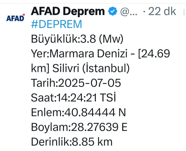 AFAD tarafından yapılan açıklamaya göre, Marmara Denizi'nde gerçekleşen depremin büyüklüğü 3,8 olarak kaydedildi. Depremin özellikle İstanbul’un bazı bölgelerinde hafif şekilde hissedildiği belirtildi.