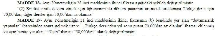 Yapılan değişiklikle, 45 olan sınıf geçme puanı Türkçe dersi için 70'e, diğer dersler için 50'ye yükseltildi.