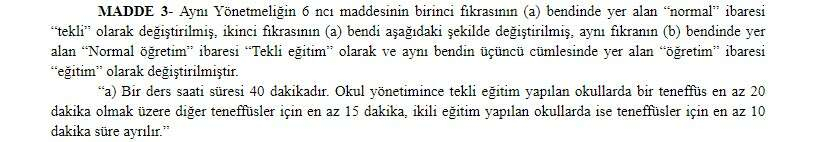 Okullarda bir teneffüs en az 20 dakika olurken sınıf geçme puanları da yükseltildi.Yapılan değişiklikle, öğrencilerin beslenmelerini rahat yapabilmeleri için okullarda teneffüslerden birinin en az 20 dakika olması sağlanacak.