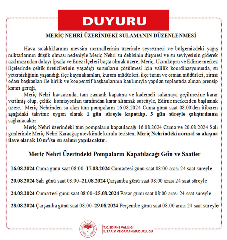 16 Ağustos 2024 tarihinden itibaren başlayacak düzenlemeler çerçevesinde, Meriç Nehri üzerindeki tüm pompalar belirli aralıklarla kapatılacak. 16 Ağustos Cuma günü saat 08.00’den itibaren başlayacak kapatma işlemi, bir gün sürecek ve pompalar üç gün süreyle çalıştırılacak. Ayrıca, kapatma günlerinde Meriç Nehri'ne normal su akışına ek olarak 10 m³/s su salımı yapılacak.