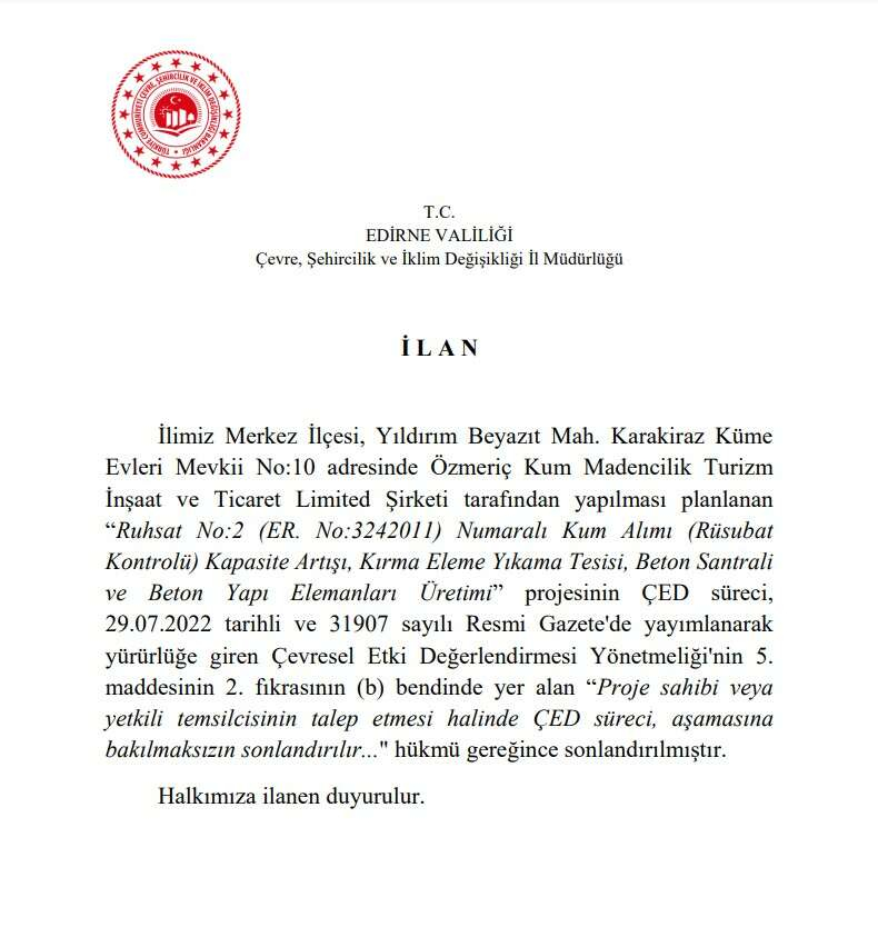 İlimiz Merkez İlçesi, Yıldırım Beyazıt Mah. Karakiraz Küme Evleri Mevkii No:10 adresinde Özmeriç Kum Madencilik Turizm İnşaat ve Ticaret Limited Şirketi tarafından yapılması planlanan “Ruhsat No:2 (ER. No:3242011) Numaralı Kum Alımı (Rüsubat Kontrolü) Kapasite Artışı, Kırma Eleme Yıkama Tesisi, Beton Santrali ve Beton Yapı Elemanları Üretimi” projesinin ÇED süreci, 29.07.2022 tarihli ve 31907 sayılı Resmi Gazete'de yayımlanarak yürürlüğe giren Çevresel Etki Değerlendirmesi Yönetmeliği'nin 5.maddesinin 2. fıkrasının (b) bendinde yer alan “Proje sahibi veya yetkili temsilcisinin talep etmesi halinde ÇED süreci, aşamasına bakılmaksızın sonlandırılır..." hükmü gereğince sonlandırılmıştır.
