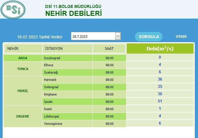Devlet Su İşleri (DSİ) 11. Bölge Müdürlüğü, Edirne’nin Tunca ve Meriç nehirlerinin debilerini internet sitesi üzerinden açıkladı. DSİ 11. Bölge Müdürlüğü verilerine göre, bugün Tunca nehrinin Suakacağı mevkiindeki debisi 6 metreküp/s, Meriç nehrinin Kirişhane mevkiindeki debisi ise 36 metreküp/s olarak ölçüldü.