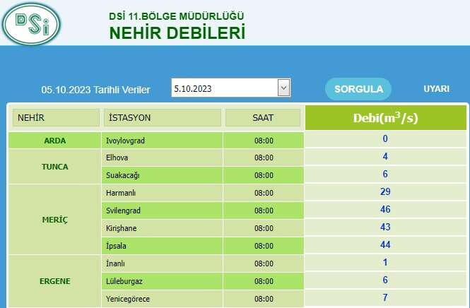 Meriç Nehri’nin Edirne bölümünün 5 Ekim 2023 tarihindeki son 6 yıllık verilerine bakıldığında; 2018 yılında Kirişhane’de 128 m3/s, İpsala’da 182 m3/s, 2019 yılında Kirişhane’de 84 m3/s, İpsala’da 90 m3/s, 2020 yılında Kirişhane’de 50 m3/s, İpsala’da 77 m3/s, 2021 yılında Kirişhane’de 58 m3/s, İpsala’da 94 m3/s, 2022 yılında Kirişhane’de 85 m3/s, İpsala’da 104 m3/s, bugün ise Kirişhane’de 43 m3/s, İpsala’da 44 m3/s olarak ölçülmesi dikkat çekti.