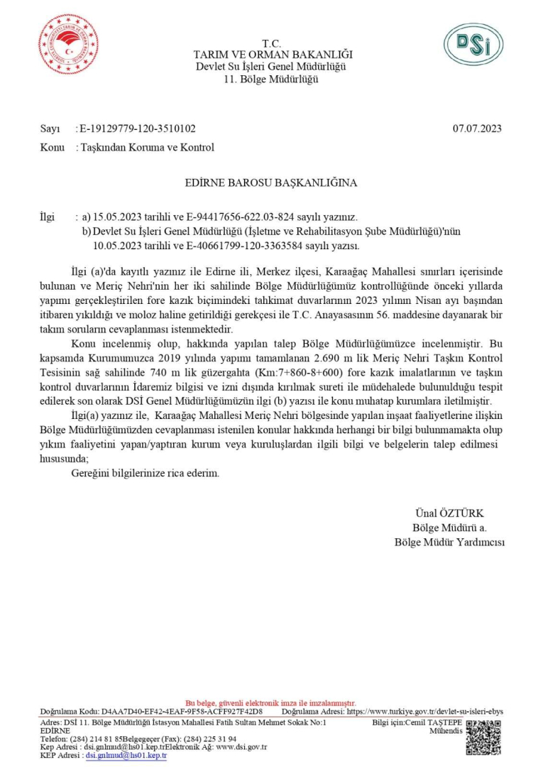 DSİ Bölge Müdür Yardımcısı Ünal Öztürk’ün imzasıyla Edirne Barosu’na verilen cevapta; “Konu incelenmiş olup, hakkında yapılan talep Bölge Müdürlüğümüzce incelenmiştir.