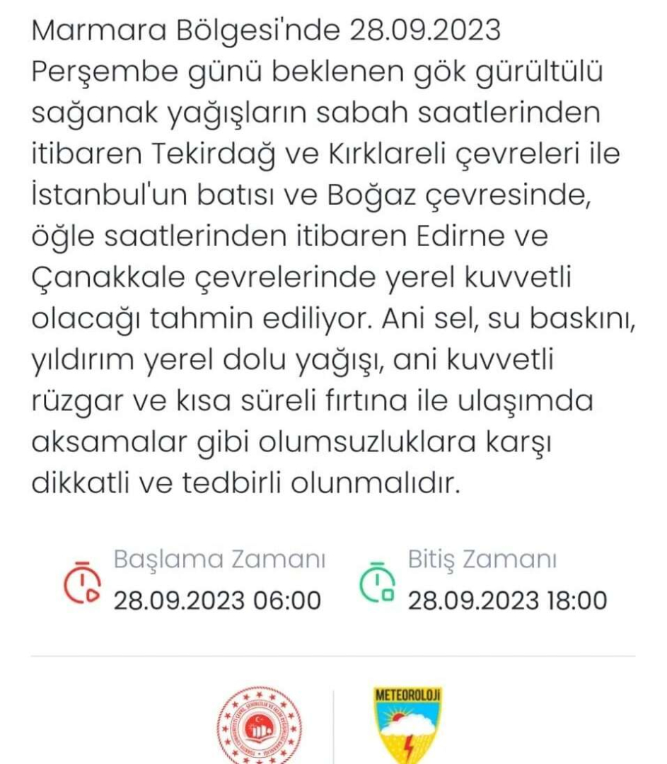 Meteoroloji Genel Müdürlüğü’nden yapılan açıklamada; “Marmara Bölgesinde 28.09.2023 Perşembe günü beklenen gök gürültülü sağanak yağışların sabah saatlerinden itibaren Tekirdağ ve Kırklareli çevreleri ile İstanbul’un batısı ve Boğaz çevresinde öğle saatlerinden itibaren Edirne ve Çanakkale çevrelerinde yerel kuvvetli olacağı tahmin ediliyor. Ani sel, su baskını, yıldırım yerel dolu yağışı, ani kuvvetli rüzgâr ve kısa süreli fırtına ile ulaşımda aksamalar gibi olumsuzluklara karşı dikkatli ve tedbirli olunmalıdır” dedi.
