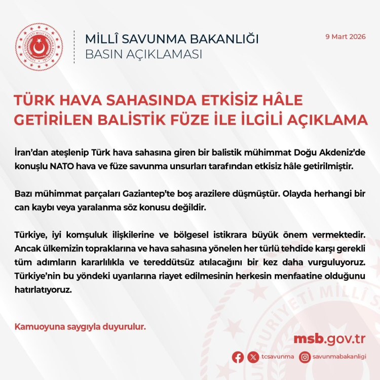 "İran’dan ateşlenip Türk hava sahasına giren bir balistik mühimmat Doğu Akdeniz’de konuşlu NATO hava ve füze savunma unsurları tarafından etkisiz hale getirilmiştir. Bazı mühimmat parçaları Gaziantep’te boş arazilere düşmüştür. Olayda herhangi bir can kaybı veya yaralanma söz konusu değildir. Türkiye, iyi komşuluk ilişkilerine ve bölgesel istikrara büyük önem vermektedir. Ancak ülkemizin topraklarına ve hava sahasına yönelen her türlü tehdide karşı gerekli tüm adımların kararlılıkla ve tereddütsüz atılacağını bir kez daha vurguluyoruz. Türkiye’nin bu yöndeki uyarılarına riayet edilmesinin herkesin menfaatine olduğunu hatırlatıyoruz."