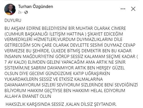 Mahalle Muhtarlığı görevinde sık sık sorunların çözümü için taleplerini açıklasa da Edirne Belediyesi’nden karşılık bulamaması nedeniyle yaşadığı psikolojik duruma dikkat çeken Özgünden; “Seçime kadar (7 ay kaldı) elimden geleni yapacağım ama artık ne sinir sistemim, ne sabrım dayanmıyor. Ben, her şey güzel olsun diye gecemi gündüzüme katıp uğraşırken; yukardakilerin sessiz ve etkisiz kalmalarına dayanamıyorum. Sizleri seviyorum. Sizlerin de beni sevdiğinizi biliyorum. Hakkım geçtiyse ben hakkımı helal ediyorum. Allah'a emanet olun. Haksızlık karşısında sessiz kalan dilsiz şeytandır” sözlerine yer verdi.