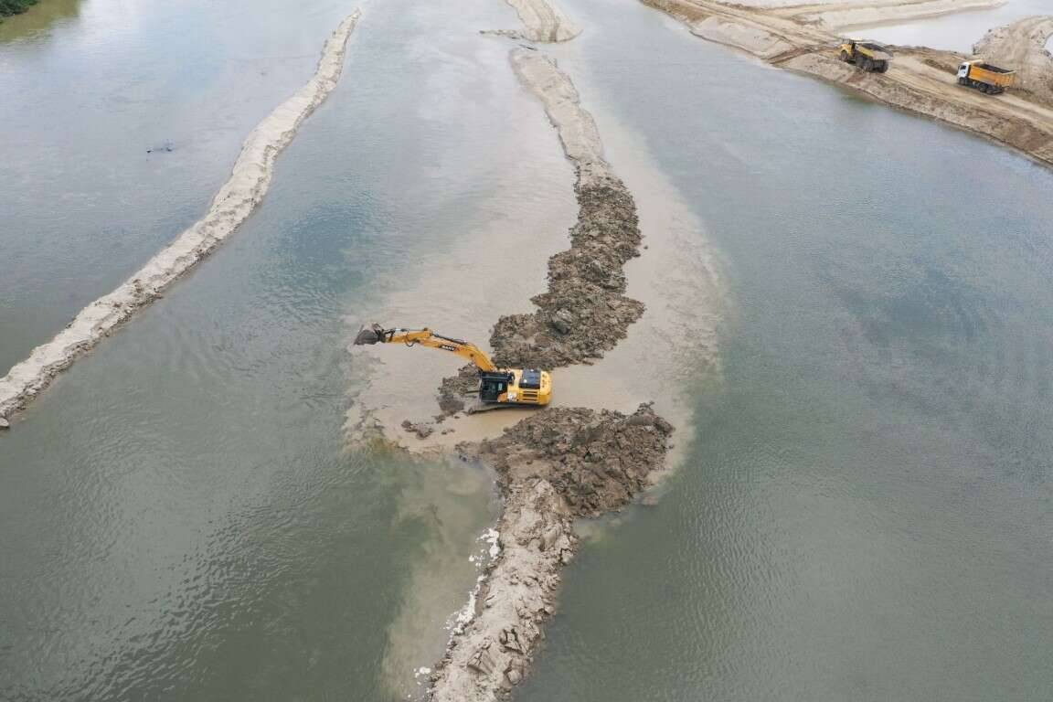 Devlet Su İşleri 11. Bölge Müdürlüğü ekipleri, Meriç Nehri'ndeki çalışmalar kapsamında Dr. Mehmet Müezzinoğlu Köprüsü ve Süvari Köprüsü arasındaki kesimde iş makineleriyle su akışını yavaşlatan kum öbeklerini temizliyor.