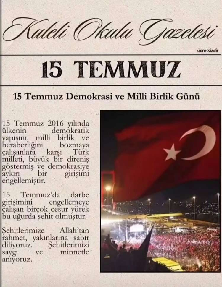 Gazetenin içeriğinde 15 Temmuz'un anlam ve önemine dair bilgiler, 15 temmuz kahramanlarının hayat hikayeleri, konu ile ilgili öğrenciler tarafından yapılan resimler, öğretmen ve öğrencilerin kaleminden çıkan düz yazılar ve şiirler bulunduruldu.