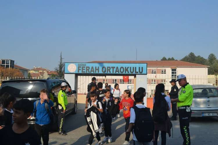 Bugün de Edirne’nin Kıyık semtinde bulun Ferah Ortaokulu önünde İl Emniyet Müdürlüğü bağlı ekipler dron uçurarak okul etrafını kontrol ederken, trafik ekipleri de öğrencilerin rahatça okuldan çıkışlarını sağlamak için trafiği düzenlediler. Çıkışta okullarının önünde polisleri gören öğrenciler, polislere sevgi gösterisinde bulundular. Öğrencilerin ilgisini gören Edirne İl Emniyet Müdürlüğüne bağlı polisler de öğrencilerle beraber hatıra fotoğrafı çektirdiler.