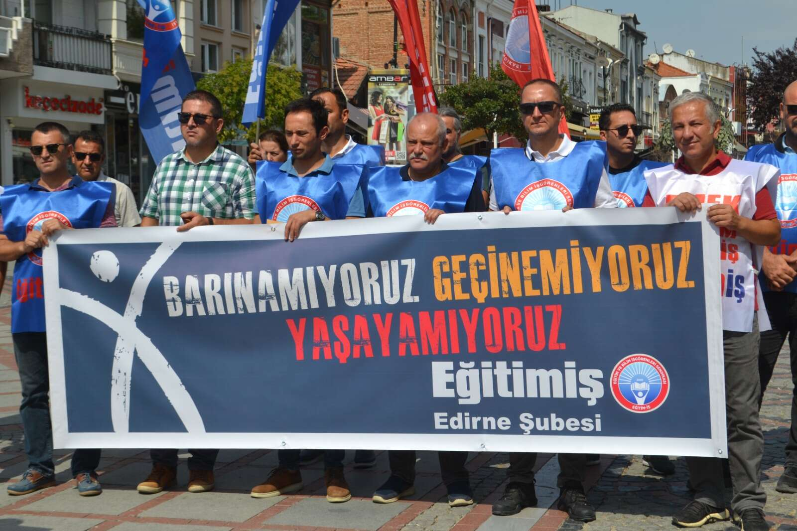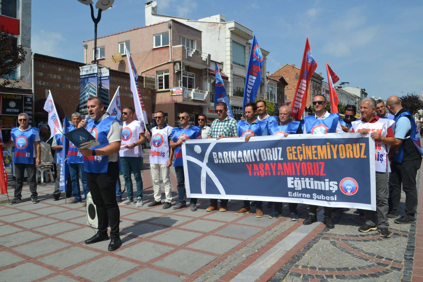 Eğitim ve Bilim İşgörenleri Sendikası (Eğitim-İş) Edirne Şubesi, ‘Barınamıyoruz, Geçinemiyoruz, Yaşayamıyoruz’ sloganı ile Saraçlar Caddesi’nde basın açıklaması düzenledi. Eğitim-İş Edirne Şube Başkanı Murat Akçay, açıklamada Türkiye’deki eğitim emekçilerinin yaşadığı sorunlara dikkat çekti.