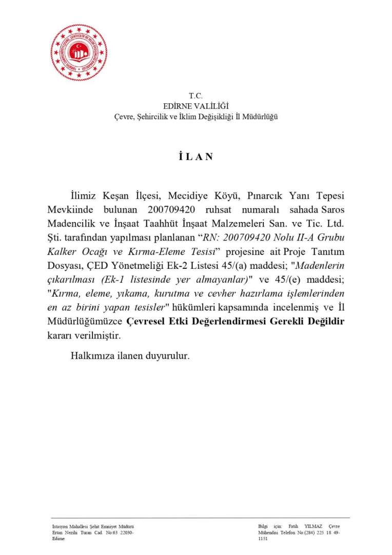 İl Müdürlüğü’nden yapılan açıklamada; “İlimiz Keşan İlçesi, Mecidiye Köyü, Pınarcık Yanı Tepesi Mevkiinde bulunan 200709420 ruhsat numaralı sahada Saros Madencilik ve İnşaat Taahhüt İnşaat Malzemeleri San. ve Tic. Ltd. Şti. tarafından yapılması planlanan “RN: 200709420 Nolu II-A Grubu Kalker Ocağı ve Kırma-Eleme Tesisi” projesine ait Proje Tanıtım Dosyası, ÇED Yönetmeliği Ek-2 Listesi 45/(a) maddesi; "Madenlerin çıkarılması (Ek-1 listesinde yer almayanlar)" ve 45/(e) maddesi; "Kırma, eleme, yıkama, kurutma ve cevher hazırlama işlemlerinden en az birini yapan tesisler" hükümleri kapsamında incelenmiş ve İl Müdürlüğümüzce Çevresel Etki Değerlendirmesi Gerekli Değildir kararı verilmiştir” sözlerine yer verildi.