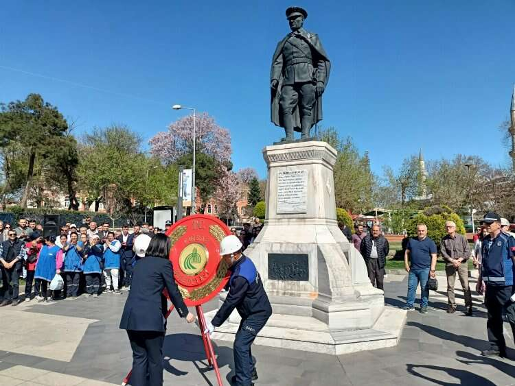 Akın, ziyaretin ardından Kahraman, Balkanlı, CHP Edirne Milletvekilleri Ediz Ün ve Ahmet Baran Yazgan, CHP belediye ve il genel meclisi üyeleri ile partililerin oluşturduğu kortej eşliğinde parti binasından Atatürk anıtına yürüdü. Yürüyüş sırasında Akın, esnaf ve vatandaşlarla da sohbet etti. Atatürk anıtına kortejle birlikte ulaşan Akın, anıta çelenk sunarken; Atatürk anıtı önünde eğilmesi katılımcılardan alkış aldı. Çelenk töreni, Türkiye Cumhuriyeti’nin kurucusu Mustafa Kemal Atatürk, silah arkadaşları ve tüm şehitler anısına bir dakikalık saygı duruşu ve İstiklal marşının okunması ile sona erdi. Akın, daha sonra partililerle birlikte devir teslim töreni için Edirne Belediye Başkanlığı binasına geçti.