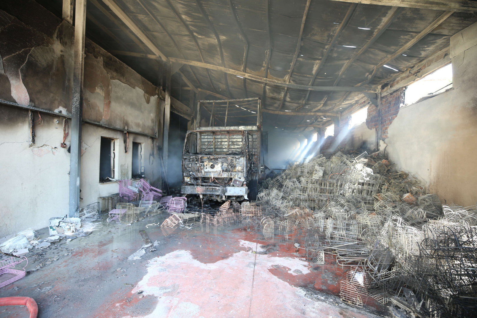 Dumandan etkilenen 2 personele sağlık ekiplerince müdahale edilirken, fabrikanın içinde malzeme indiren bir kamyon da yandı.