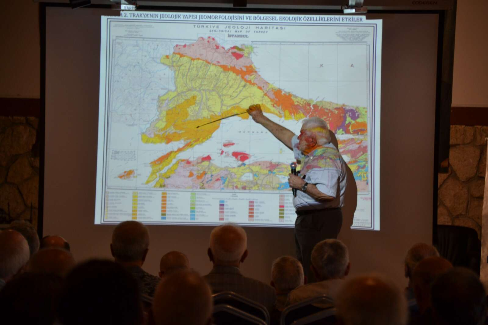 Istranca dağlarınun, kuzeyden boğaza kadar uzandığını belirten Kantarcı; “İç Trakya’ya inen yamaçlarında kireç taşları var. Ortasında da İç Trakya ovaları yer alır. İç Trakya dediğimiz yer, alçak ova, 200 metrenin altındadır. Yeraltı suyu, bizim için can damarımızdır. Trakya’da çok tuhaf bir durum var. Meteoroloji Genel Müdürlüğü, Türkiye’nin her tarafına yeni yazıcı istasyonlar kurdu, Trakya’da yok. Pınarhisar, Demirköy’de istasyonlar çalışmıyor. Geçen gün İğneada’da yüksek yağışta sel oldu, meteorolojiden bilgi yok. Saray’da yok. Kırklareli, Lüleburgaz, Çorlu, Edirne ve Tekirdağ’da istasyonlar var. Bu değerlerle iklim analizi olmaz” ifadelerini kullandı.