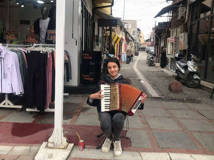 Akordiyonu ile sokak çalgıcılığı yapan Maria, 7. sınıf öğrencisi olduğunu ve aynı zamanda harçlığını çıkarmak için sokak çalgıcılığı yaptığını söyledi.