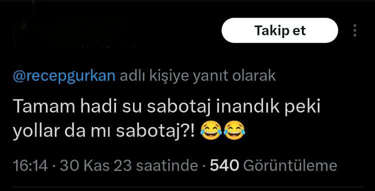 Kentteki yolların bozuk olmasını da eleştiren vatandaşlar ise; “Tamam hadi su sabotaj inandık; peki, yollar da mı sabotaj?!”, “Yollarda da sabotaj var galiba kendi kendine bozuluyor” gibi ifadelerde bulundular.