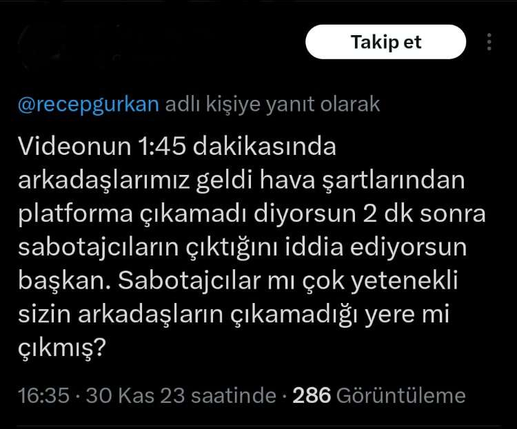 Bir diğer kullanıcı da; “Videonun 1.45 dakikasında, ‘Arkadaşlarımız geldi, hava şartlarından platforma çıkamadı’ diyorsun. 2 dakika sonra sabotajcıların çıktığını iddia ediyorsun başkan. Sabotajcılar mı çok yetenekli, sizin arkadaşların çıkamadığı yere mi çıkmış?” şeklinde yorum yaptı. Bir başka kullanıcı da canlı yayın videosunda ses kalitesinin çok kötü olduğu için esprili bir yorum yaparak; “Videoyu da sabote etmişler herhalde Recep bey, hiçbir şey anlaşılmıyor” dedi.