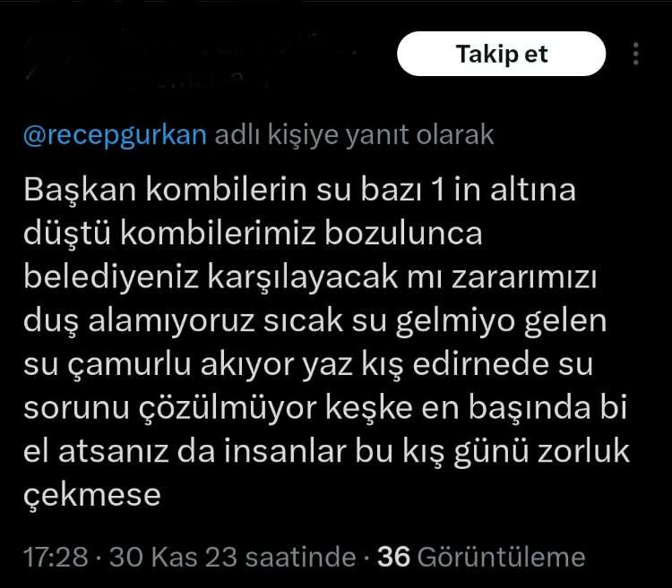 Bazı vatandaşlar da suların ne zaman normale döneceğini sorarken; “Tamam başkan, evet sabotaj. Peki, bu evlerimize gelen kirli su ne zaman normale dönecek? Elimizi yüzümüzü bile yıkayamıyoruz. Ne zaman düzeleceği ile ilgili açıklama yapmanız lazım”, “Başkan, kombilerin su bazı 1’in altına düştü. Kombilerimiz bozulunca belediyeniz karşılayacak mı zararımızı? Duş alamıyoruz, sıcak su gelmiyor, gelen su çamurlu akıyor. Yaz, kış Edirne’de su sorunu çözülmüyor. Keşke en başında bir el atsanız da insanlar bu kış günü zorluk çekmese” yorumlarını yaptılar.