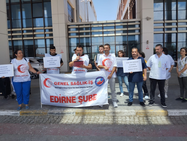 Memurlara yapılan zamları protesto etmek için Genel Sağlık İş Sendikası, Edirne Sultan 1’inci Murat Devlet Hastanesi önünde basın açıklaması düzenledi.