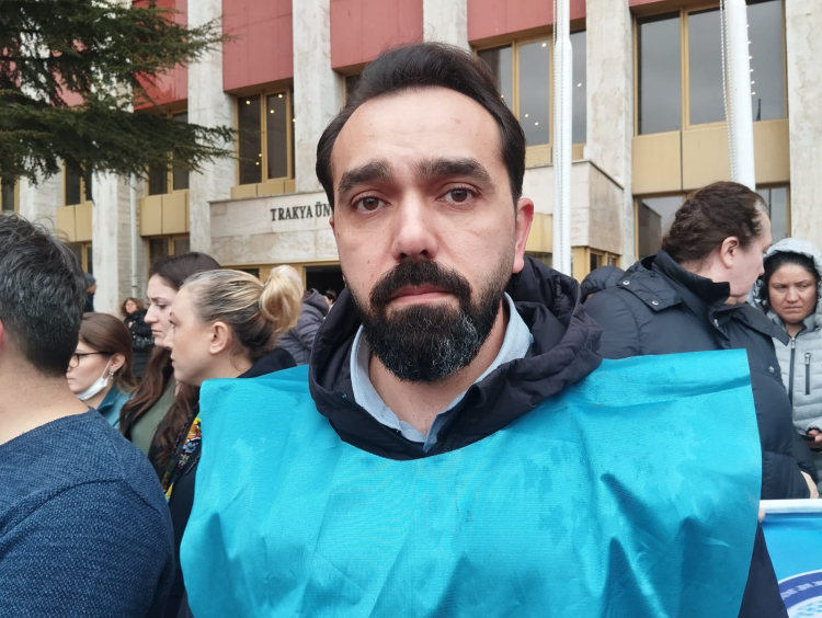Trakya Üniversitesi’nde çalışan Sağlık-Sen üyeleri, üniversite çalışanlarının ulaşımı için çıkardığı servis araçlarını kaldırması konusunda basın açıklaması düzenlediler.
