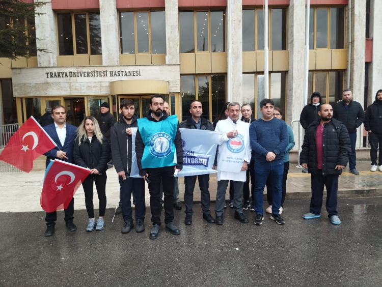 Trakya Üniversitesi Tıp Fakültesi önünde düzenlenen ve Sağlık-Sen Edirne Üniversite Şube Başkanı Sinan Palulu’nun okuduğu açıklamada, “Öğrenci şehri olan Edirne’de, bu kadar çalışanın iş yerine zamanında ulaşması, yerel ulaşım firması marifetiyle mümkün gözükmemektedir” denilerek şu ifadelere yer verildi; “Bugün burada toplanmamızın amacı son yıllarda kamu görevlileri adına artan hayat pahalılığı ve zorlaşan geçim koşullarıdır. Bu konuyla bağlantılı olarak, kurumumuzun bizlere sağladığı güzel hizmetlerin birinden daha vazgeçme çabasıdır. Sabit ücretli kesimin başta memurlar, emekliler ve asgari ücretliler olmak üzere yaşadığı geçim sıkıntısını hepimiz biliyoruz bilmekle de kalmayıp hep birlikte yaşıyoruz. Bu geçim sıkıntısı içerisinde cebimizde onlarca delik varken, açılmadık bir delik olan ulaşımında bize yük olmasını istemiyoruz. Ocak ayı itibariyle servis hizmetinin çok maliyetli olmasından dolayı kaldırılacağı haberi tarafımızca tüm üniversitemize yayılmış durumdadır. Üniversitemizde profesörden temizlik personeline kadar arasında gelir bakımından uçurum olan çok çeşitli unvanlar bulunmaktadır. Hastane çalışanlarımızın bir kısmı bu hizmete hiç ihtiyaç duymadığı ve kullanmadığı gibi bir kısım için ise vazgeçilmeyecek kadar önemlidir. Bu konunun sadece mali boyutla sınırlı kalmayıp çok taraflı etkileri olacağı açıktır. 365 gün 7/24 hizmet veren, çalışan kişi sayısı ve hizmet verdiği kişi sayısını düşündüğümüzde, Balkanların en büyük en kapsamlı hastanesi Trakya Üniversitesi Sağlık ve Uygulama Araştırma Merkezidir. Yaşadığımız Öğrenci şehrinde bu kadar çalışanın iş yerine zamanında ulaşması, yerel ulaşım firması marifetiyle mümkün gözükmemektedir. Sabah 08.00’de mesaisi başlayan bir hemşire arkadaşımız servisin geçeceği yere en fazla 10 dakika önce geldiğinde mesaisine yetişebilmekteydi, yerel ulaşım araçlarıyla gelmeye çalıştığında ise 30 dakika veya 1 saat önce yani karanlıkta araç beklemeye çıkmak zorunda kalacaktır. Hastane çalışanlarımızın yüzde 70 inden fazlasını kadınların oluşturduğunu da unutmamak gerekir. Ayrıca, meslektaşlarımızın mesaisine zamanında yetişememesi nedeniyle; karşılıklı tutanaklar tutulmasına, kişilerin birbirinin istemsizce zamanından çalmasına ve iş barışının bozulmasına sebebiyet vereceği gün gibi ortadadır.”