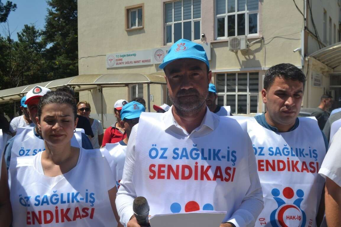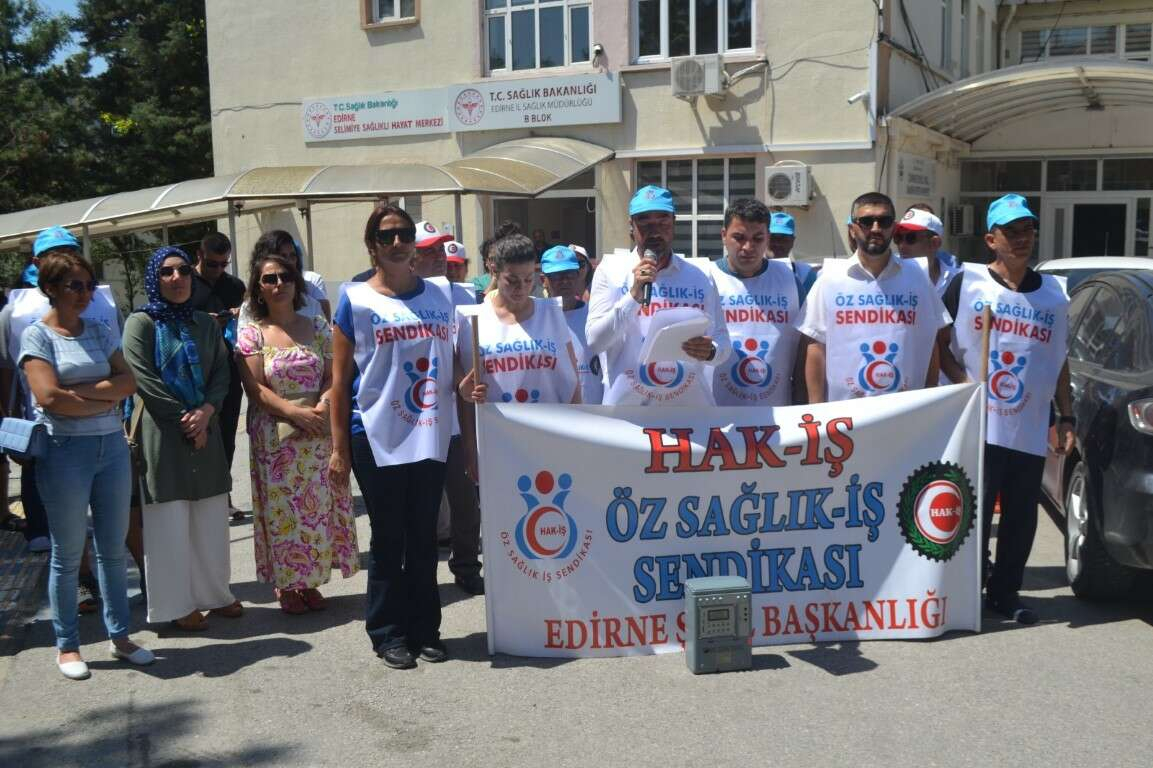 Hak-İş’e bağlı Öz Sağlık-İş Sendikasının Sağlık Bakanlığı bünyesinde çalışan sağlık işçilerinin, işveren sendikası TÜHİS ile imzaladığı Toplu İş Sözleşmesi uyarınca geriye dönük alacaklarının ödenmesi için tüm Türkiye’de eş zamanlı basın açıklaması düzenledi. Tüm Türkiye’de olduğu gibi Edirne’de de düzenlenen açıklama, Edirne İl Sağlık Müdürlüğü önünde yapıldı.