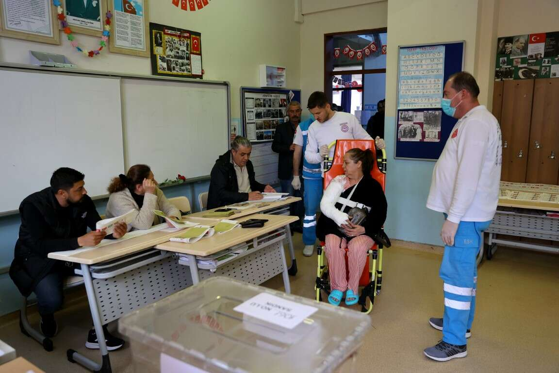 İl merkezinde 14 sağlık personeli ve 5 araçla görev yapan ekipler, oy kullanmak isteyen hastaları odalarından sandalye tipi sedyeyle alarak hasta nakil ambulansıyla okullara götürdü.
