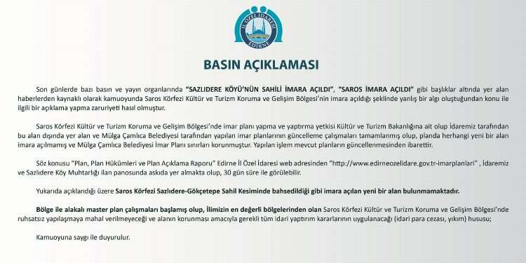 Açıklamada, söz konusu plan, plan hükümleri ve plan açıklama raporunun, Edirne İl Özel İdaresi’ne ait internet sitesi ve idare panosu ile Sazlıdere köyü muhtarlığı panosunda askıda olduğu belirtilerek; “Saros Körfezi Sazlıdere - Gökçetepe sahil kesiminde bahsedildiği gibi imara açılan yeni bir alan bulunmamaktadır. Bölge ile alakalı master plan çalışmaları başlamış olup, ilimizin en değerli bölgelerinden olan Saros Körfezi Kültür ve Turizm Koruma ve Gelişim Bölgesi’nde ruhsatsız yapılaşmaya mahal verilmeyeceği ve alanın korunması amacıyla gerekli tüm idari yaptırım kararlarının uygulanacağı (idari para cezası, yıkım) hususu kamuoyuna saygı ile duyurulur” sözlerine yer verildi.