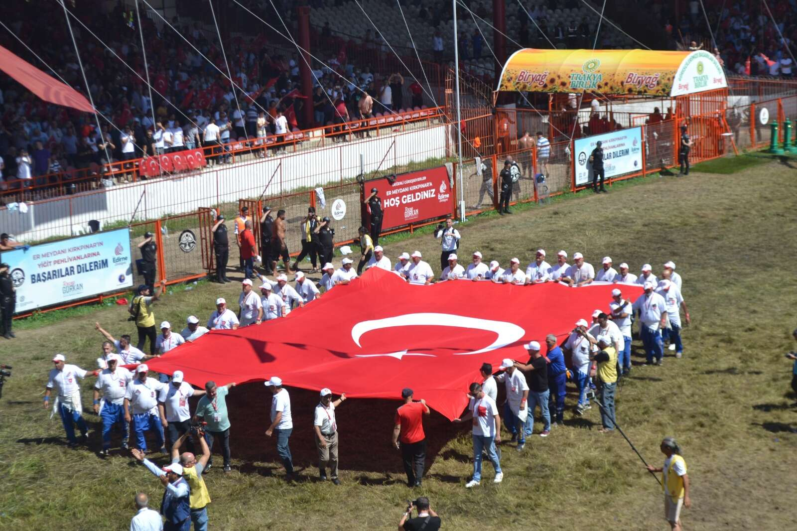 Ağalık ihalesinin tamamlanmasının ardından Er Meydanı'nda dev Türk bayrağı ile geçit töreni düzenlendi. Türk bayrağına tüm güreşseverler de ellerindeki bayraklarla eşlik etti.