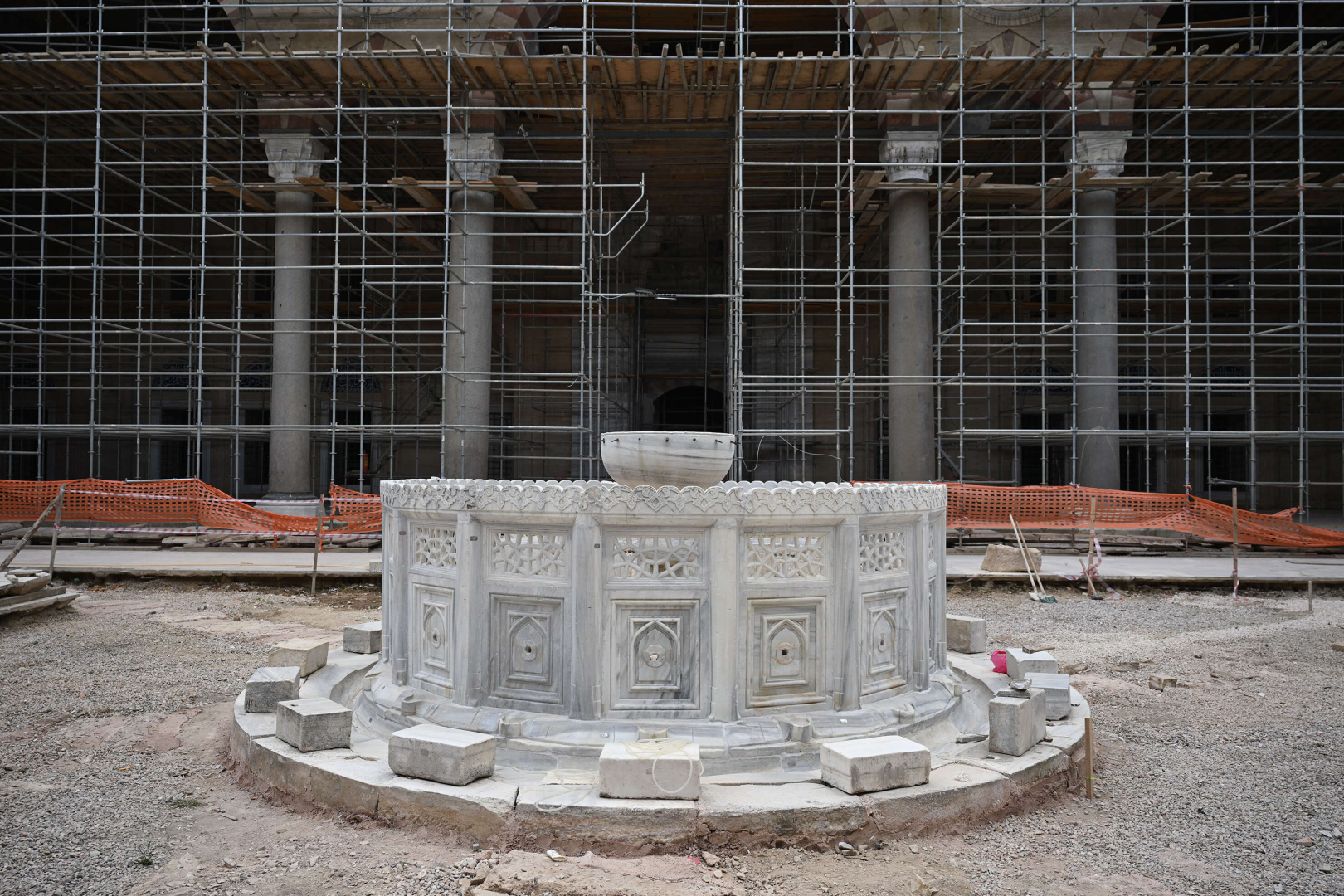 "Camimizin kubbe ve duvarlarında yapılan raspalar sonucu elde edilen yeni veriler doğrultusunda kalem işi çalışmalarımız devam etmektedir. Diğer taraftan minarelerimizin güçlendirme ve restorasyon çalışmaları sürmektedir. Minarelerimizin külah altında bulunan ve günümüze sadece bir tanesi ulaşan çinileri orijinaline uygun olarak ürettik ve iki minaremizde yerine monte ettik. Onarımı tamamlanan bir minaremizin iskelesini de en kısa sürede sökmeye başlayacağız."