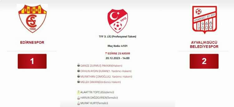 TFF 3. Lig A Grubu’nda mücadele eden Edirnespor, 15’inci hafta maçında Ayvalıkgücü Belediyespor ile karşılaştı. 25 Kasım Stadı’nda bugün 14.00’te başlayan karşılaşmayı hakem Gamze Durmuş Pakkan yönetti. Pakkan’ın yardımcılıklarını ise Orhun Aydın Duran, Murathan Çomoğlu ve Melek Dakan yaptı.