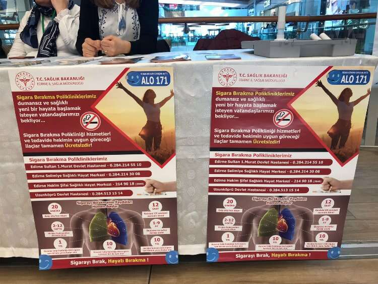 Edirne İl Sağlık Müdürlüğü ve Yeşilay Danışmanlık Merkezi (YEDAM) Edirne Şubesi, 9 Şubat Dünya Sigarayı Bırakma günü dolayısıyla farkındalık yaratmak adına Edirne’de bulunun bir alışveriş merkezinde stant açtı. Vatandaşlara sigaranın sağlık üzerindeki olumsuz etkileri, bağımlılığın yarattığı zararlar ve sağlıklı bir yaşam için sigarayı bırakmanın önemi hakkında bilgiler verildi.