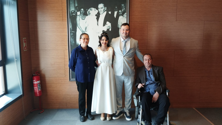 Kıyılan nikah sonrası nikah memurundan evlilik cüzdanını alan çift, yakınlarıyla birlikte bu mutlu anı ölümsüz kılmak için hatıra fotoğrafı çektirdi.