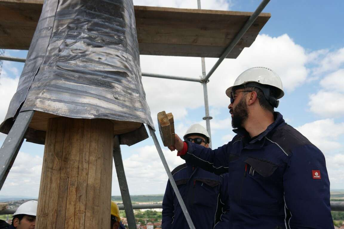 İşçiler 29 parça olan alemin her bir parçasını kubbeye kadar asansörle taşıyıp merdiven yardımıyla yukarıya çıkarıyor.
