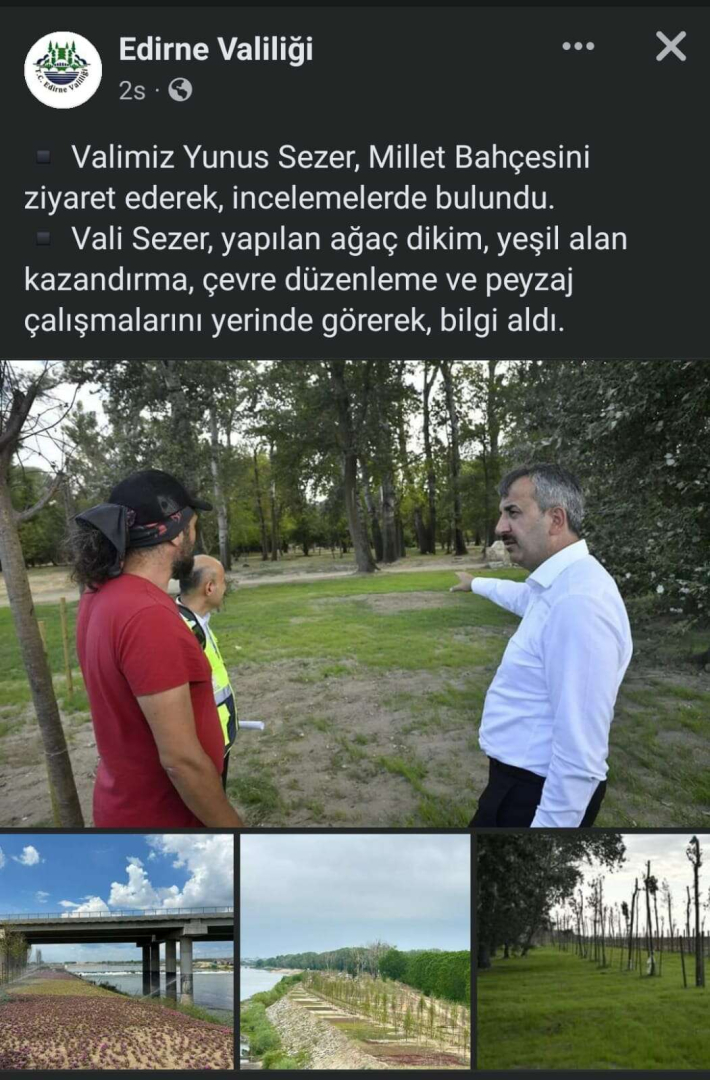 Edirne Valisi Yunus Sezer, Edirne’de halk arasında Söğütlük olarak adlandırılan Edirne İzzet Arseven Kent Ormanı’nı ziyaret etti. Sezer’in ziyareti, Edirne Valiliği’nin resmi ‘Facebook’ hesabından duyurulurken ‘Millet Bahçesi’ ifadesi kullanıldı.