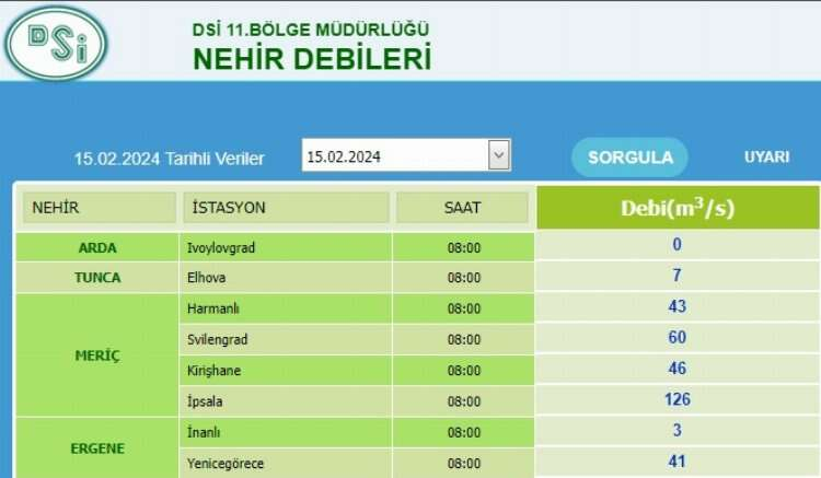 15 Şubat 2024 tarihindeki verilerde ise Tunca Nehri’nin Suakacağı ya Değirmenyeni mevkiindeki debi verilerine yer verilmezken; Meriç Nehrinin Kirişhane mevkiindeki debisinin 46 m3/s olarak ölçülmesi dikkat çekti.