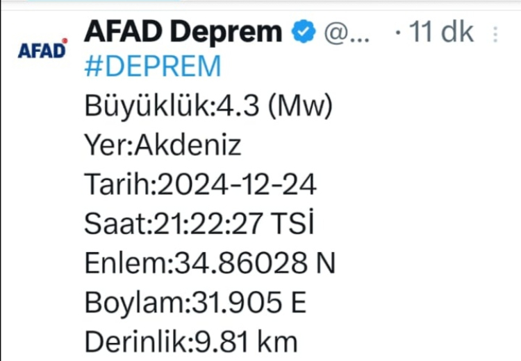 Afet ve Acil Durum Yönetimi Başkanlığının (AFAD) internet sitesinde yer alan bilgiye göre, Akdeniz'de saat 21.22'de 4,3 büyüklüğünde sarsıntı kaydedildi.