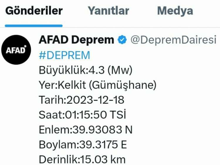 Afet ve Acil Durum Yönetimi Başkanlığı'nın (AFAD) verilerine göre, Gümüşhane'de 4,3 büyüklüğünde bir deprem meydana geldi.
