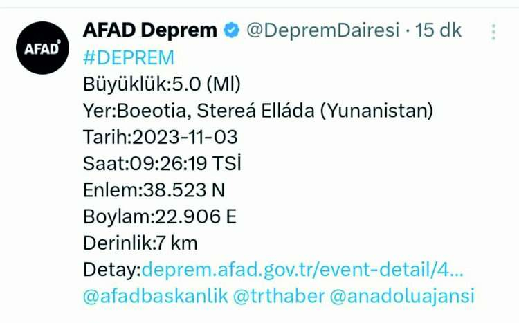 AFAD'tan alınan verilere göre bugün Yunanistan'ta 5.0 büyüklüğünde deprem meydana geldi.