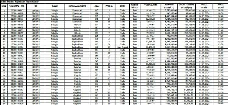 Duyuruda, en yüksek tahmini bedel 4 milyon 525 bin 861 TL ile Domurcalı köyündeki 12 bin 931 m2’lik tarla, en düşük tahmini bedel ise 637 bin 821 TL ile Geçkinli köyündeki 2 bin 126 m2’lik tarla cinsindeki taşınmazlar olarak açıklandı.